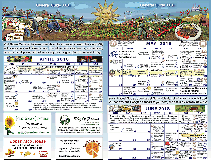 The events are conveniently included on the printed General Guide calendars that can be posted to refrigerators as reminders and decoration for spring. There is a banner of the growing season, with icons of the connected communities along I-94 between Battle Creek and Jackson. The best thing about the General Guide are the Google calendars online with links to official information about each event, and a directory to area calendars for many destinations and organizations. The Google calendars can be synced with personal device calendars for handy access to fun things to do locally. Visit GeneralGuide.net for information on education, events, entertainment, progress, cultural sharing and tourism. Learn about highlights in each community and how to post information about community events to local calendars.