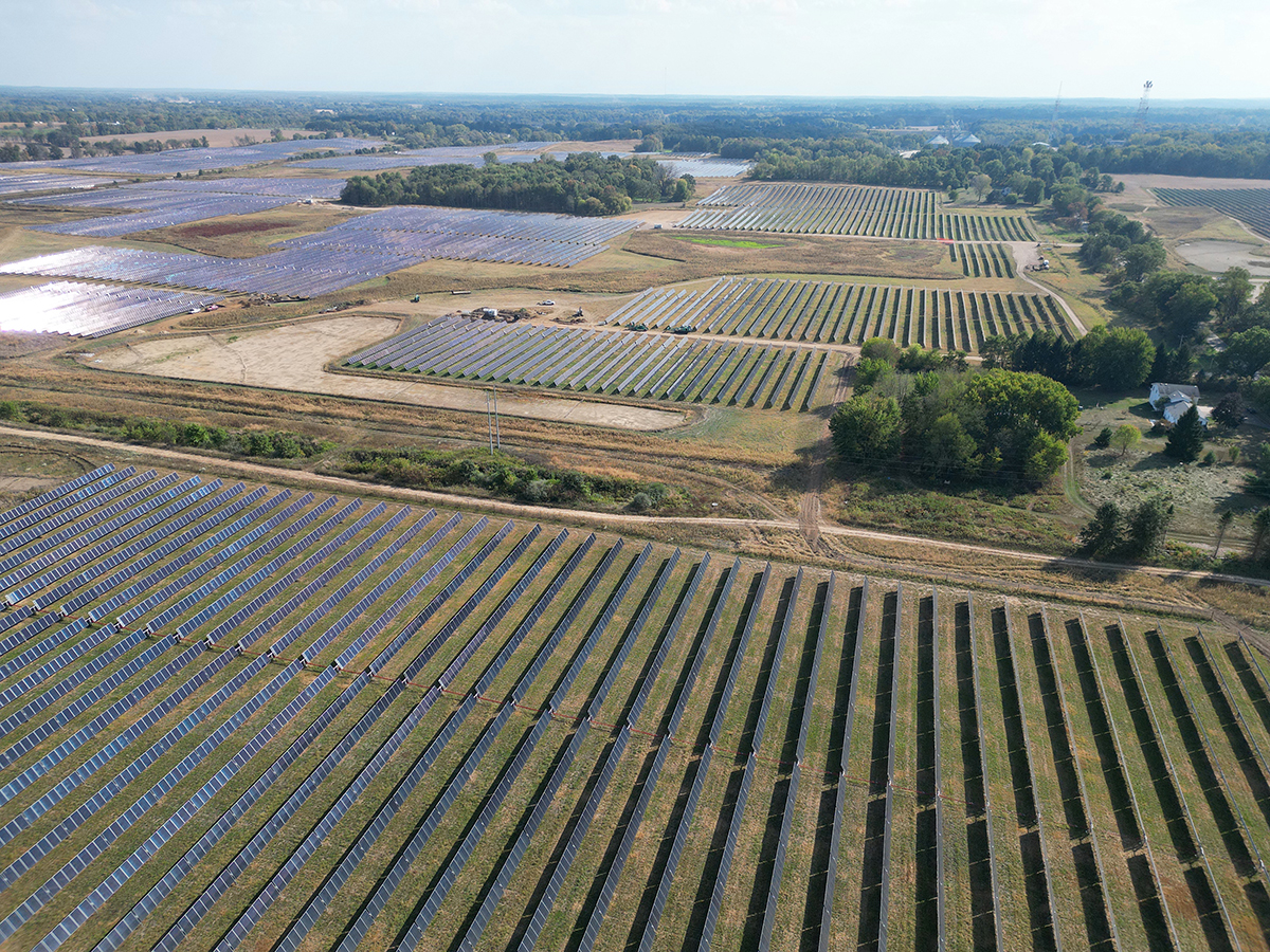 The site features more than 300,000 solar panels manufactured in the U.S.A. by First Solar at its facilities in Ohio and Alabama. Each panel is mounted on a single-axis tracker that follows the sun, supported by A-frame foundations designed for stability through Michigan’s freeze-thaw seasons and heavy winds. Crews of three can install roughly 1,000 panels in a single day, completing long rows across the property.