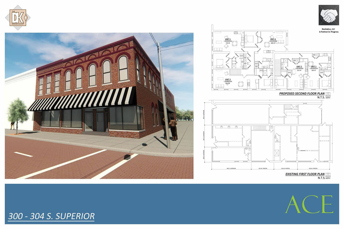 An artists’ concept and blueprints of 300 – 304 S. Superior St. Albion, Michigan funded by the ACE financial group.