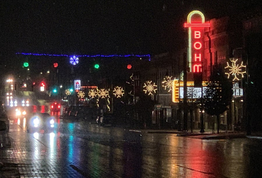 Albion, Michigan has some aspects built in that are quite lovely no matter the weather. One of the highlights is the brick streets downtown that is set off nicely when damp. Another one that shows up well at night is the marque of the Bohm Theatre. Some highlights of Albion downtown not shown in this photo include the world’s largest Coca-Cola mural (likely the world’s largest,) the train depot, and the city being built right over a river.