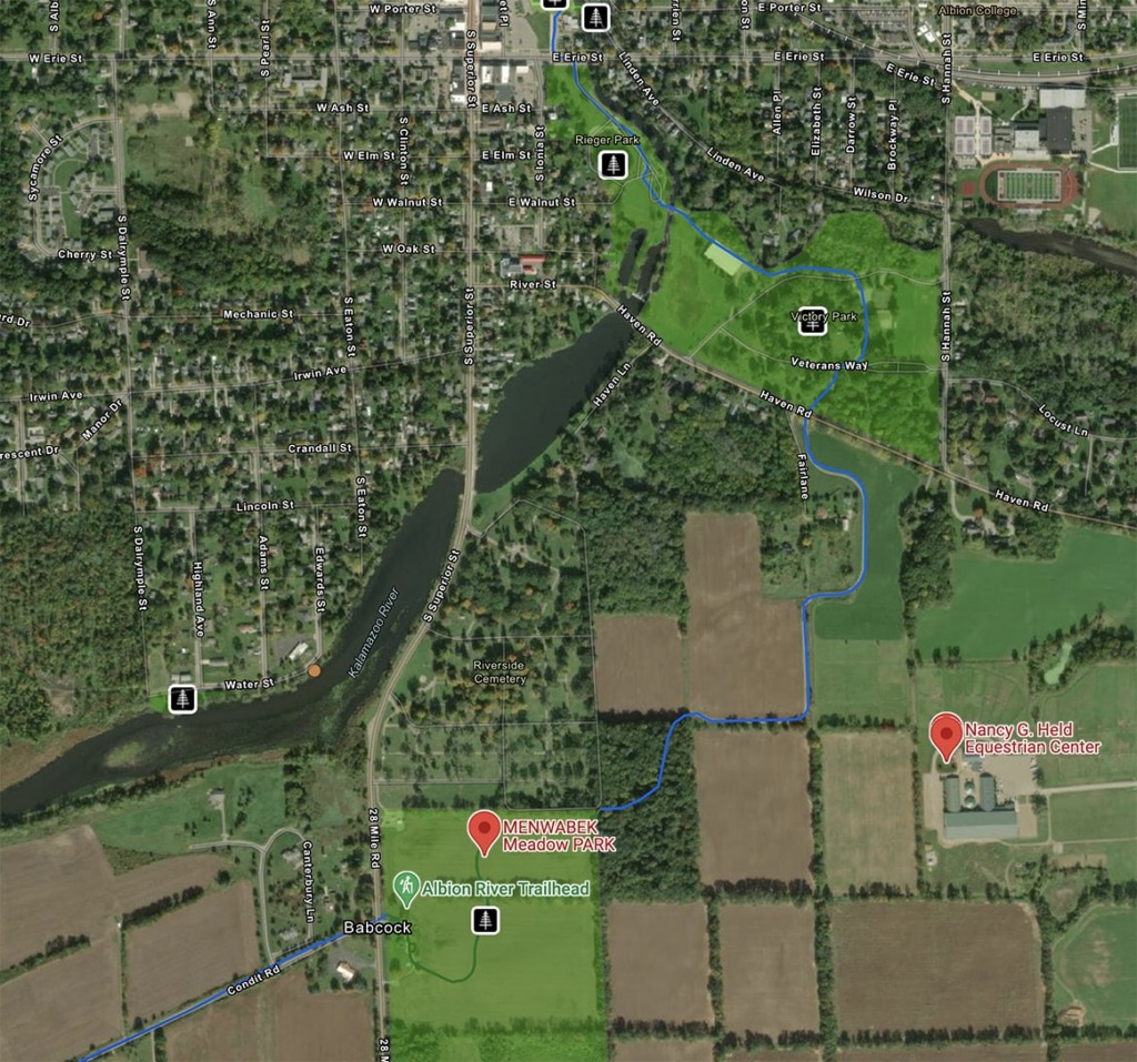 The map above is from the County Map of the trails with the spots added for Ménwabek Meadow Park and the Equestrian Center. You can see the basic county map of this area by clicking the image above or clicking here: Calhoun County Interactive Parks Map